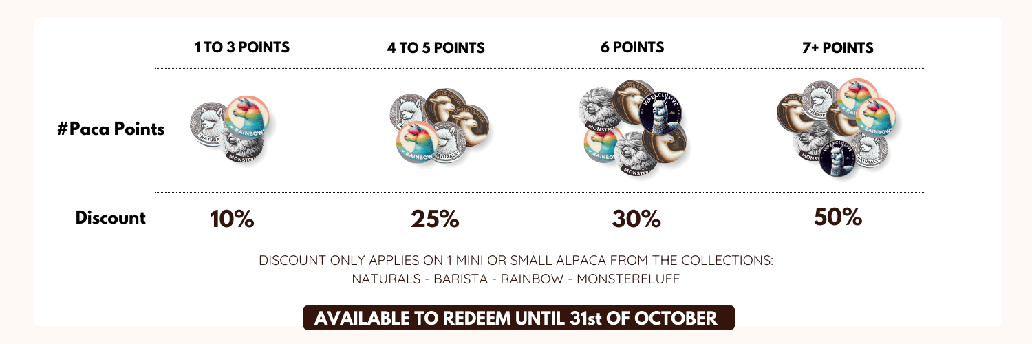 1 to 3 Paca Points earns you a 10% discount on your next Mini or Small alpaca.
