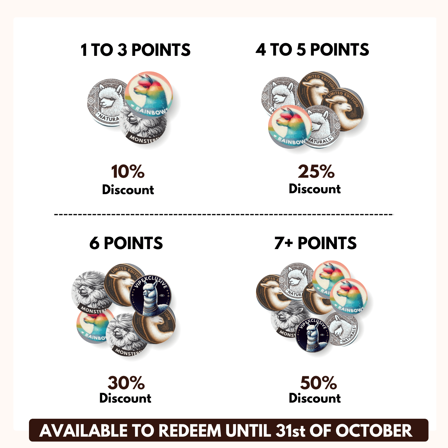 4 to 5 Paca Points earns you a 25% discount on your next Mini or Small alpaca.